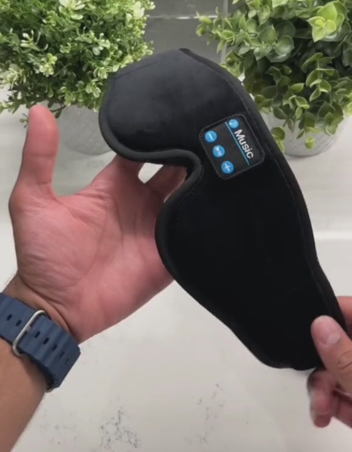 Die Dreamz™ Maske verfügt über ein breites, weiches Band ohne störende Schnalle, eine konturierte 3D-Form, die Druck auf die Augenpartie verhindert, und integrierte Bluetooth-Kopfhörer für entspannende Klänge beim Einschlafen.